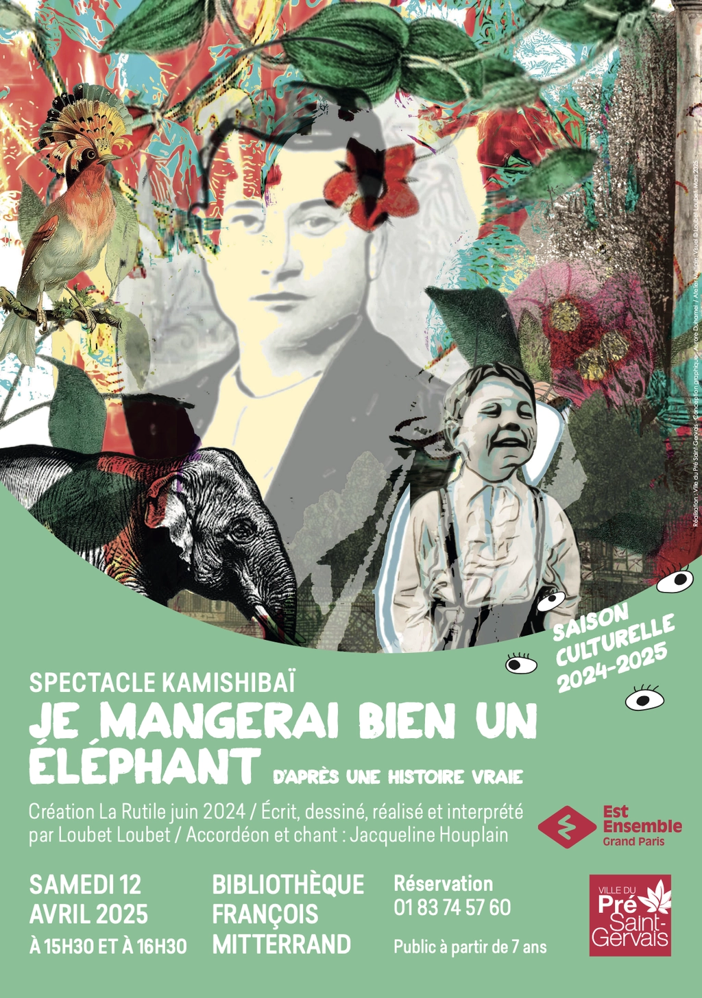 Une histoire contée, chantée et accompagnée à l’accordéon, en regard de 17 illustrations originales qui se succèdent, au rythme d’un dialogue entre un enfant et un éléphant dans un décor initiatique : le Jardin des Plantes de Paris. Pour l’enfant il est le lieu de passage de l’âge des découvertes à celui de la raison. Le docte éléphant invoque un lieu ancré dans la République des Lumières, fondateur de l’Histoire Naturelle et de la conscience Universelle.
