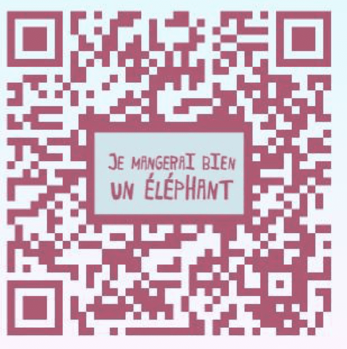 Visez avec l’appareil photo de votre smartphone le Qrcode pour vous conduire directement au teaser du spectacle JE MANGERAI BIEN UN ÉLÉPHANT Ou cliquez sur ce lien pour le voir directement.